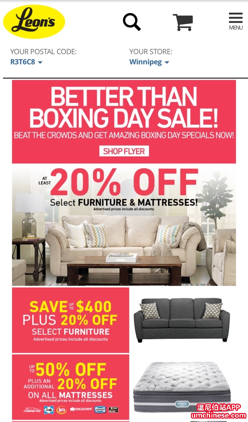 Leons 各款优质沙发、餐桌椅减价后再打8折! 床垫类5折后再打8折!满$498免费送货到家! 请联系Michael Liu 公共微信:leonsliu06 电话204-583-1912 地址:1755 Ellice Ave