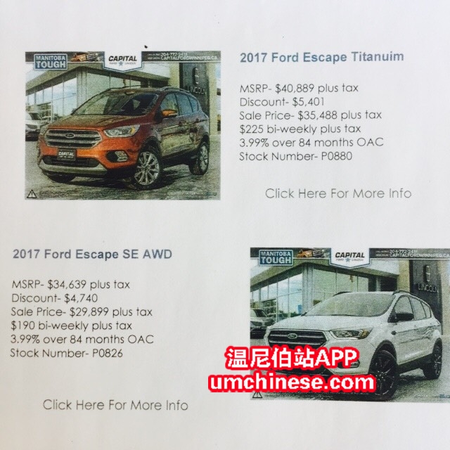 本周四是我们CAPITAL FORD LINCOLN集团40周年店庆 特有两台店庆特惠车推荐给大家 超低价! 超大折扣!全新车! 只要两台! 2017 Ford Escape Titanium AWD 原价: $40889 现价:$35488 2017 Ford Escape SE AWD 原 ...