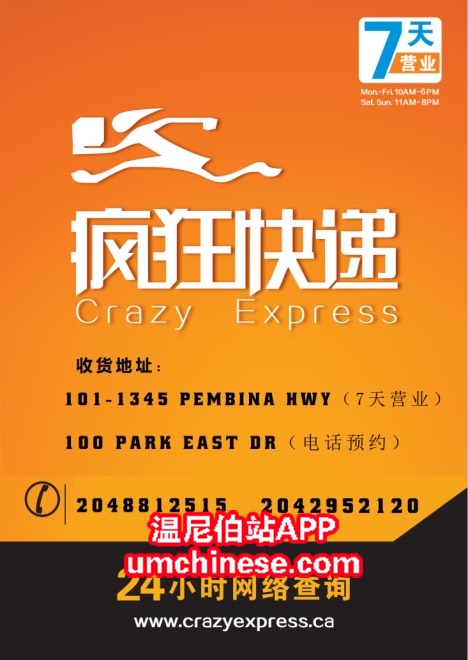 疯狂快递双址同时为大家服务。 疯狂快递新营业地址及时间表 地址一:101-1345 pembina hwy (停车方便、多路公交直达) 营业时间: 周一至周日 11:00am-6:00pm 发货前一日会延时收货 地址二:100 park ...