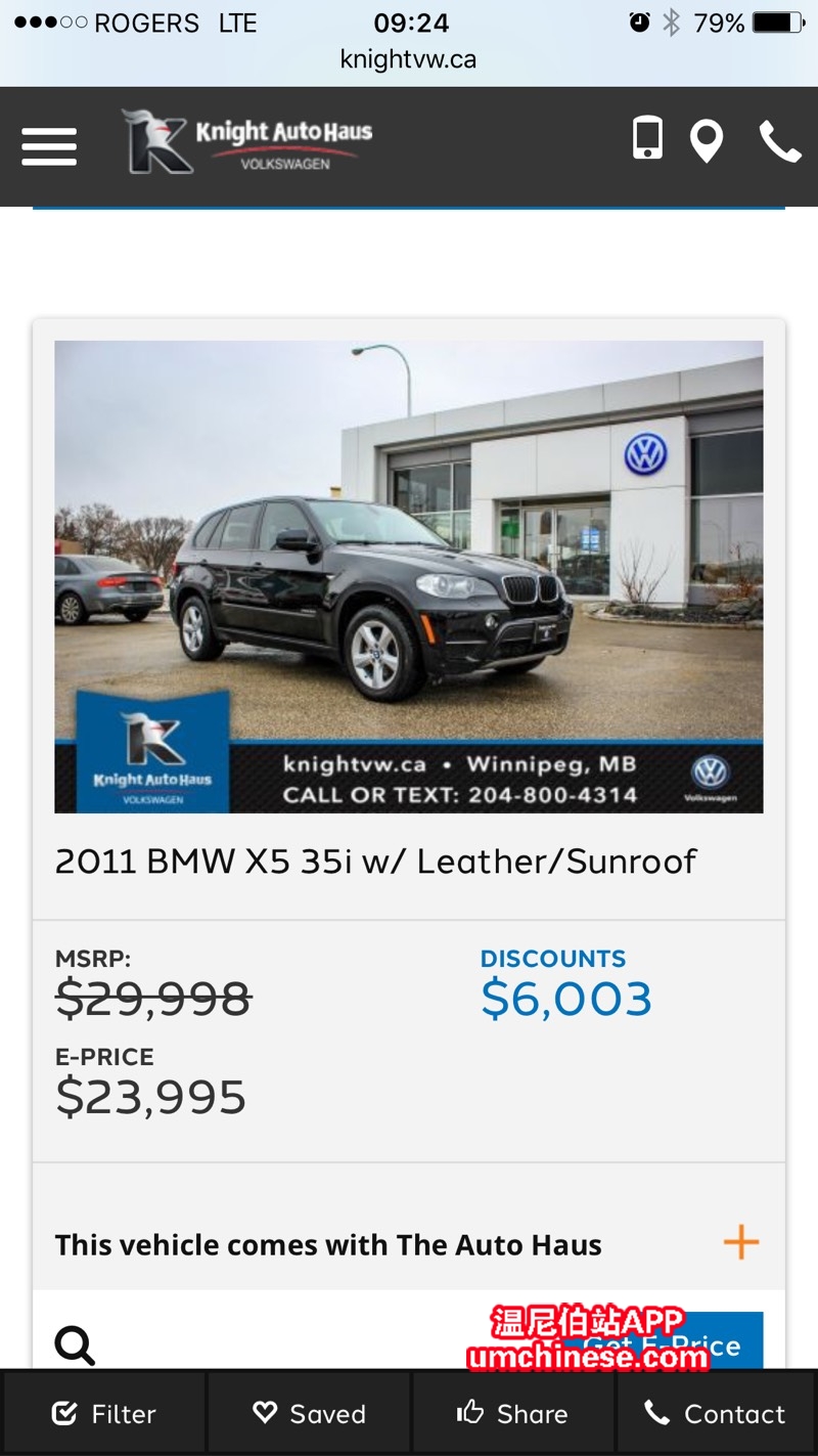 给大伙推荐一台我们大众车行现在降价出售的二手2011的宝马X5,开了9万八千公里,Xdrive35i。车况特别好,同年份全省最低价,感兴趣的话请尽快联系大众销售文思 电话2048981860 地址660 pembina hwy