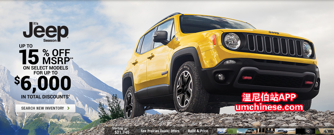 2017大切诺基:15% off MSRP 2017自由光(cherokee): up to 15% off MSRP 2017自由侠(renegade):up to 15% off MSRP 更多详细信息咨询 Chris Gui:204-951-4017 微信:m520514