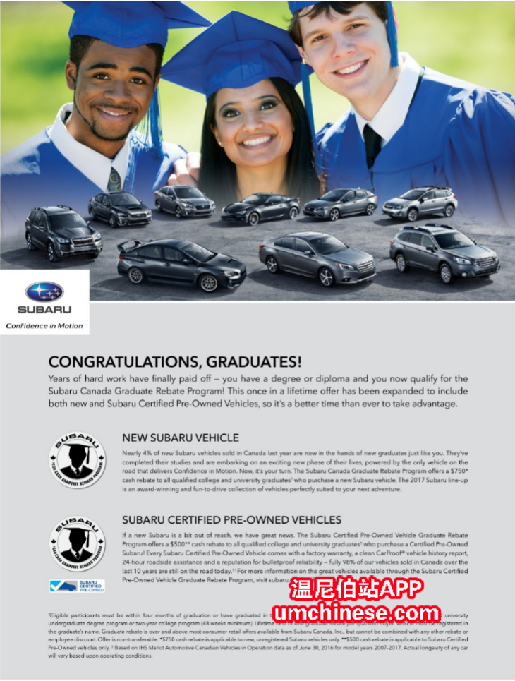 已经毕业的你或即将毕业的你是否考虑在温尼伯继续生活? 没有车的你是否在温尼伯寒冷的冬天寸步难行? 作为学生的你是否因为手头拮据而难以拥有一辆属于自己的车? 斯巴鲁强大的全时四驱系统将会是你在温尼伯生 ...