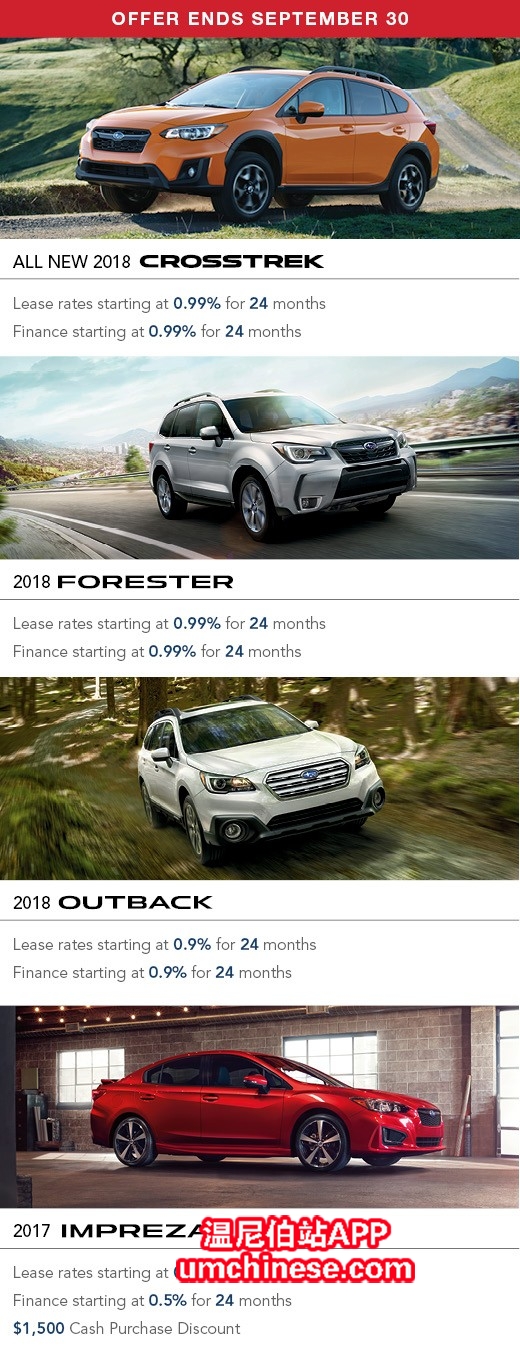 Jim Pattison Subaru Winnipeg Subaru Winnipeg 华人销售:Jax 温尼伯斯巴鲁车行九月份优惠促销活动火热进行中! 2018款Crosstrek, Fiance或Lease利率低至0.99% 2018款Outback, Fiance或Lease0.9% 201 ...