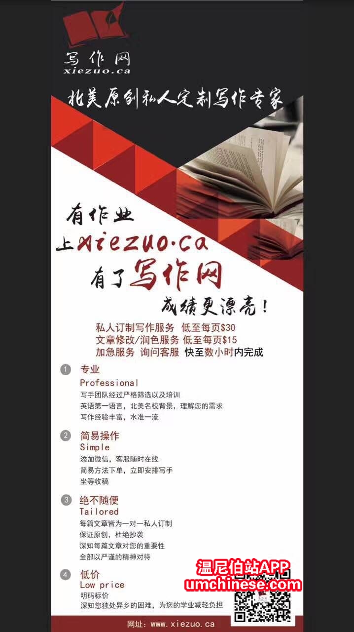 亲爱的小伙伴们,你们是否也和我一样有时感觉英语写作实在太难,PPT太麻烦,网课不好上,每次都来不及写又懒得写?不用着急,北美写作专家——写作网的客户经理张晨,全权为您解决各种写作、网课难题。保证价格最低 ...