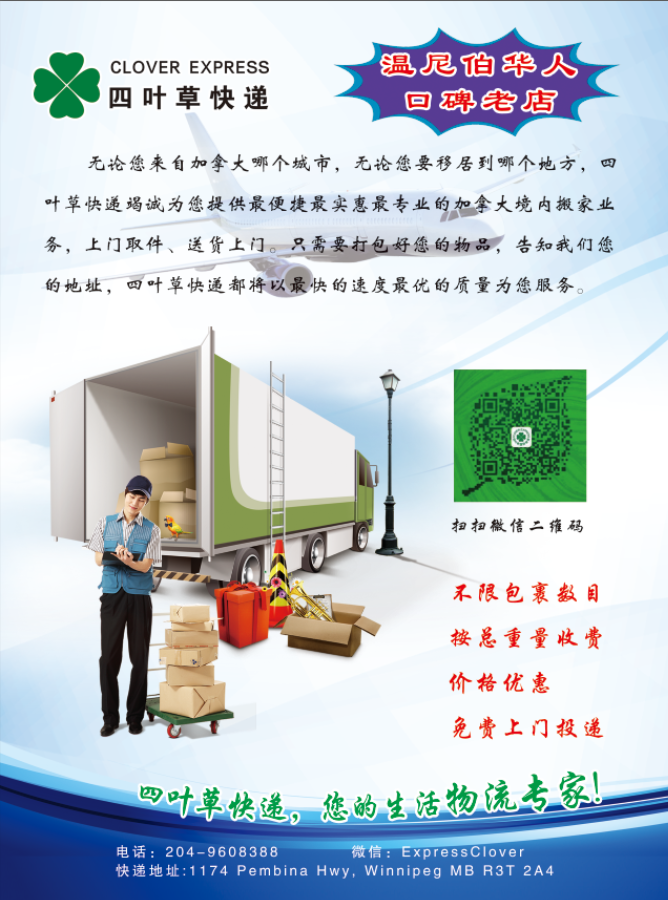 温尼伯华人口碑老店四叶草快递现重磅推出加拿大境内搬家业务,不限包裹个数,按总重量收费,价格优惠,免费上门服务。 回国包裹价格低至3.99每磅,详情请与我们联系。 电话 : (204) 960-8388地址: 1174 Pembina Hw ...