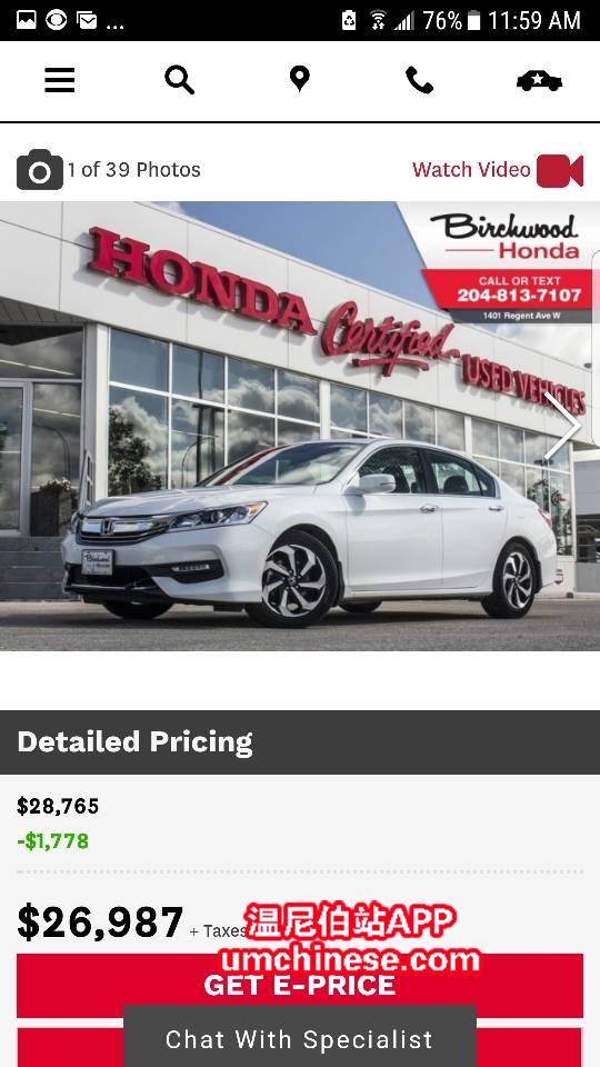 2016 本田雅阁 EXL 白色, 皮座, 真皮包裹方向盘, 自动天窗, 分区温控, 前后排座椅加热, 倒车影像, 道路驾驶辅助, 无事故记录。提供看车接送。 Birchwood Honda on Regent 中文 ...