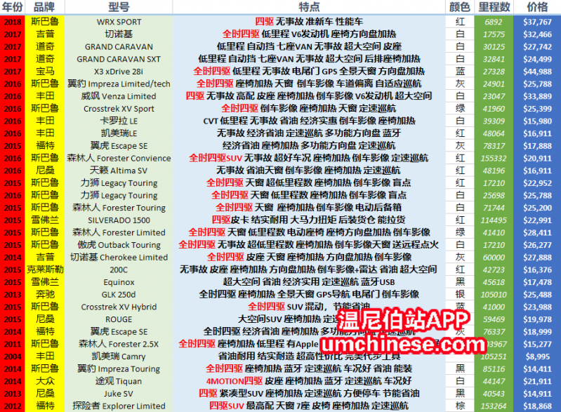 Subaru Winnipeg 车行 二月月末所有二手车报价单汇总所有二手车均有Carproof,曼省Safety报告提供给客户,保证所有二手车库存无rebuilt记录,无任何欠款! 温尼伯专业贷款团队,4年华人车贷服务经验,贷款成功率99% ...