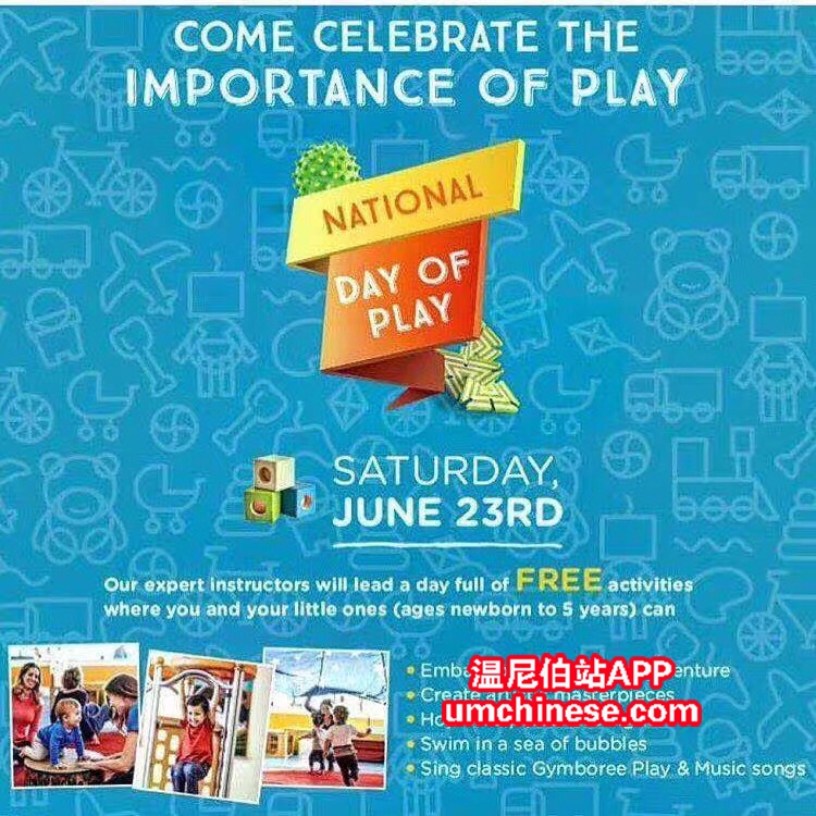 Gymboree National Day of Play 本周六 六月23号 上午9:00-下午3:00, 金宝贝早教中心全球对外开放日! 让专业的早教老师带领宝宝免费活动! 还在等什么? 带宝宝来泡泡的海洋里游泳吧! 带着宝宝乘坐金宝贝的彩虹伞 ...