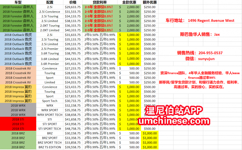 Subaru Winnipeg 2018款,以及2019款斯巴鲁新车报价,Finance、Lease利率汇总! 斯巴鲁华人销售:Jax 车行地址:1496 Regent Avenue West, Winnipeg, MB R2C 3A8 联系电话:204-955-0537 微信:sunyujun 2 ...