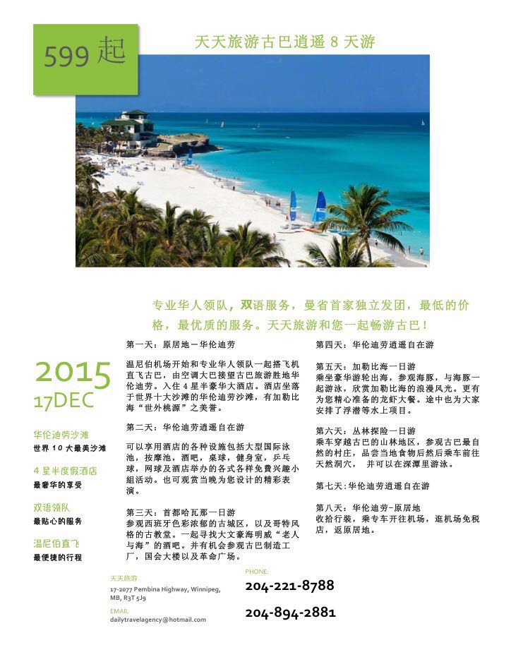 关于【古巴黄金海岸8天7晚逍遥游】和大家详细说明一下,全程优秀华人领队,国语英语双语服务,七晚4星半奢华酒店,不限量任食任喝,温尼伯独家包机价。 三人房每人$599+古巴税$390 双人房每人$689+古巴税$390 儿童和婴儿按实际年龄标准收费 三天的项目属于自费项目,可以参加也可以不参加,自由选择,如果参加会有自费加小费每人400加币的费用。这是全部的价格了,没有任何隐形收费,大家可以做对比。 出团日期:12月17日 保证出团 大家也可以参考12月17日出发的四星半酒店,比我们的团会贵,而且没有华人导游陪同。 谢谢大家对天天旅游的支持。 |