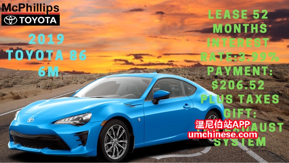 LEASE 新车今日特惠! (**2019丰田86 6档手动基础款**) (**9701366**) 这台车今日只要 (**$206.52每两周 **利息3.99%**52个月Lease**) O.A.C. 加税. 现金(**$32,288.65**)加税. 赠送:价值$1,513.98 TRD 排气系统 ...