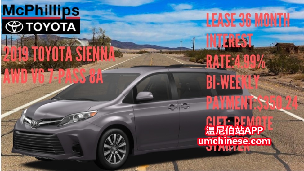 LEASE 新车今日特惠! (**2019塞纳LE 四驱7座**) (**S212705**) 这台车今日只要 (**$350.24每两周 **利息4.99%**36个月Lease**) O.A.C. 加税. 现金(**$43,164.75**)加税. 送:远程打火 欢迎今天给我打电话:204- ...