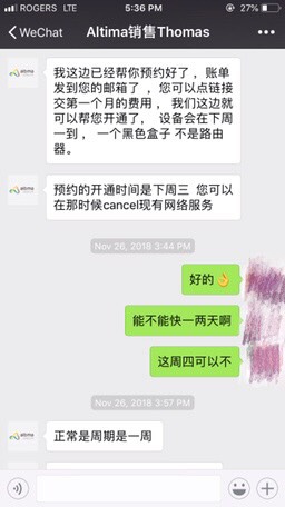 我刚查了一下这个公司,我认为首先不看楼主的遭遇是否属实 1,这个公司是有英文和法语界面的(事实上法语更多) 2,我从多伦多过来这个公司还算知名 3,第一个截图里销售就和你说有个小黑盒子要邮寄了啊 4,预付费包括华人网络公司cik也是这么做的啊 不明白哪里有问题 |