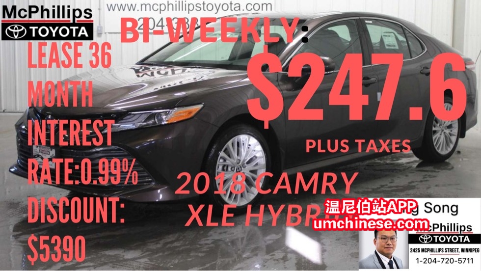 LEASE 2018 凯美瑞 新车今日特惠! (**2018 Toyota Camry XLE Hybrid**) (**U002558**) 这台车今日只要 (**$247.63每两周 **利息0.99 %**36个月Lease**) O.A.C. 加税. 现金(**$39,663.75**)加税. 欢迎今天给我打电 ...