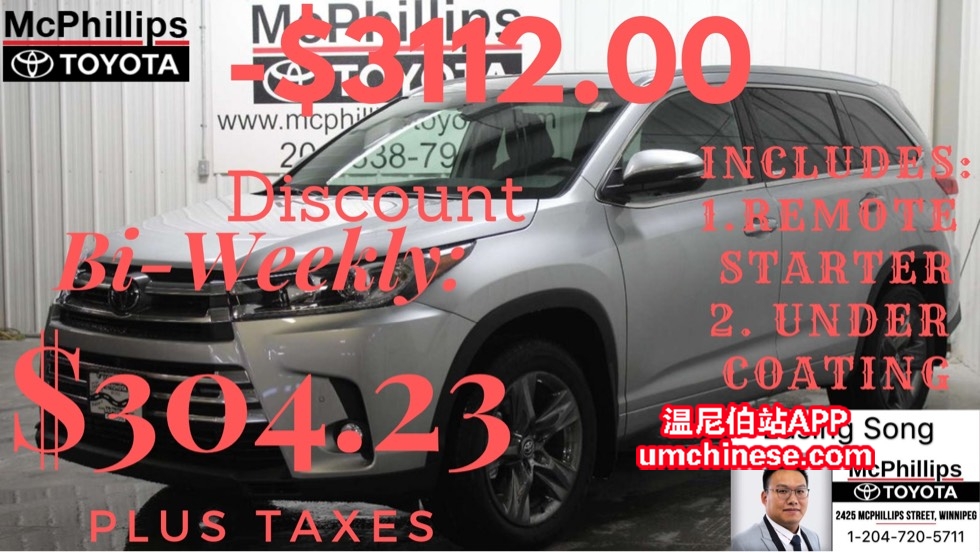 LEASE 2018丰田汉兰达顶配新车今日特惠! (**2018 Toyota Highlander LIMITED**) (**S886775**) 这台车今日只要 (**$304.23每两周 **利息3.99%**60个月Lease**) O.A.C. 加税. 现金(**$50,886.58**)加税. 欢 ...