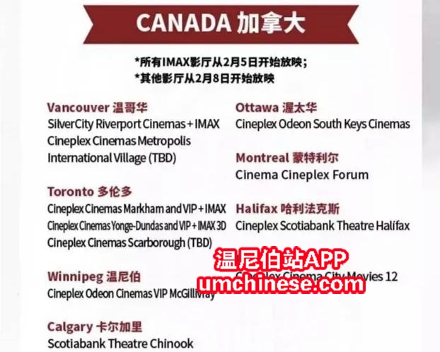 看宣传说8号在温尼伯上映 然而cineplex的app上查不到啊