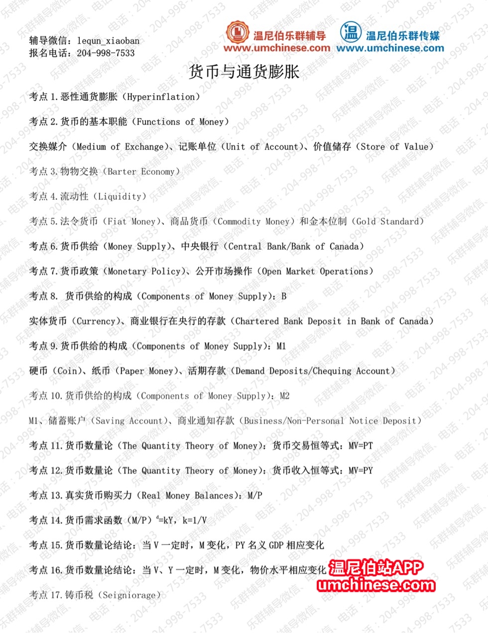 Econ2020 货币与通货膨胀 考点、知识点、公示表总结!期中突击班全面开启 有需要的朋友快来联系我吧!