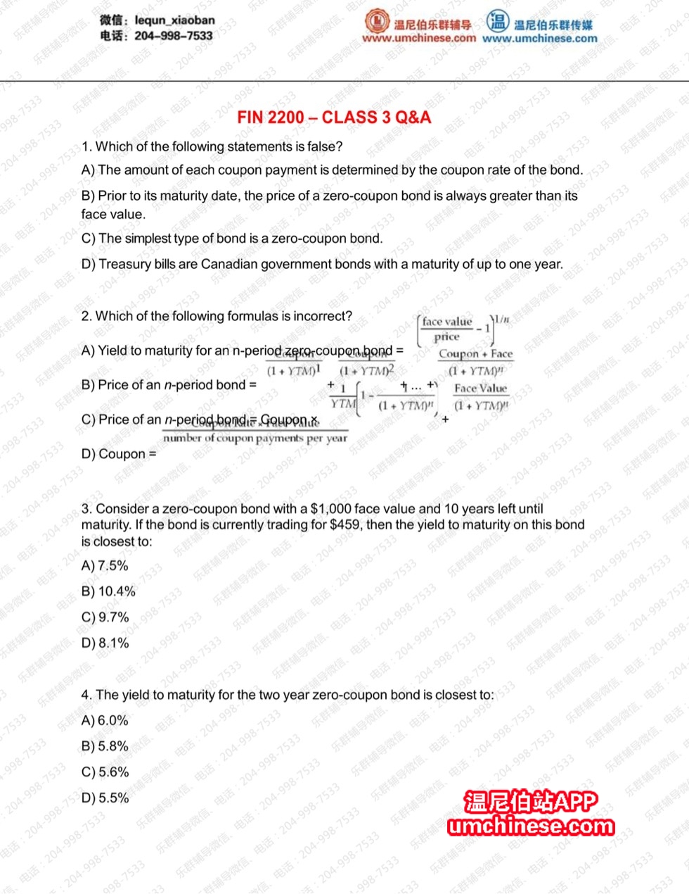 FIN2200期中考在即!乐群辅导为大家准备了一波习题,快来动手练练吧~需要答案的童鞋请加我们课程辅导顾问微信哟~期中突击班已全面开启,详情快来咨询我!
