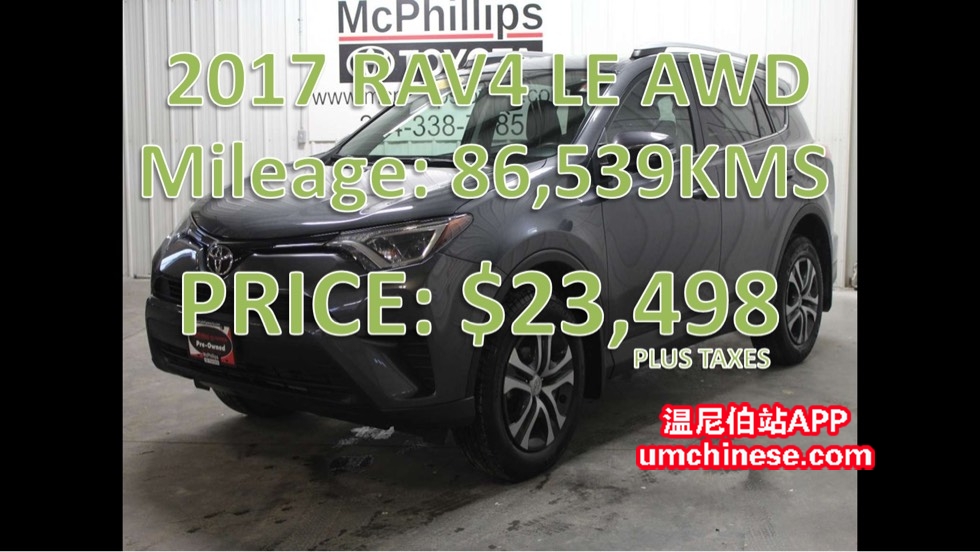 2017 丰田 RAV4 LE AWD今日特惠! (**2017 TOYOTA RAV4 LE AWD**) (**W854964A**) 公里数:86539KMS 这台车今日只要 $23,498加税. 欢迎今天给我打电话:204-720-5711加我的微信:Easing001 **额外需求** 如 ...