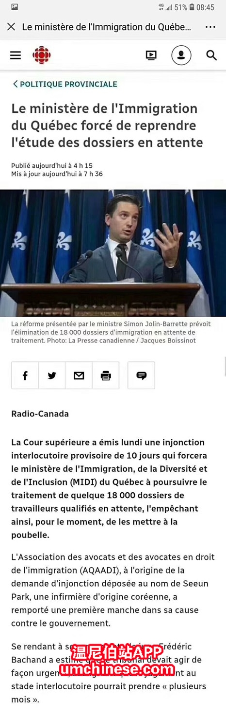 昨天最高法院驳回魁北克移民局取消18000名等待中的魁北克技术移民申请的计划,要求移民局继续审理这些申请。