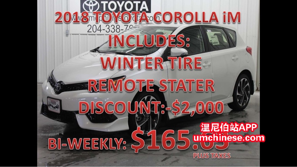 FIANACE 2018丰田卡罗拉iM今日特惠! (**2018 TOYOTA COROLLA IM **) (**J554974**) 这台车今日只要 (**$165.63每两周 **利息7.99%**96个月FINANCE**) O.A.C. 加税. 现金(**$25,426.75**)加税. 欢迎今天给我打电话 ...