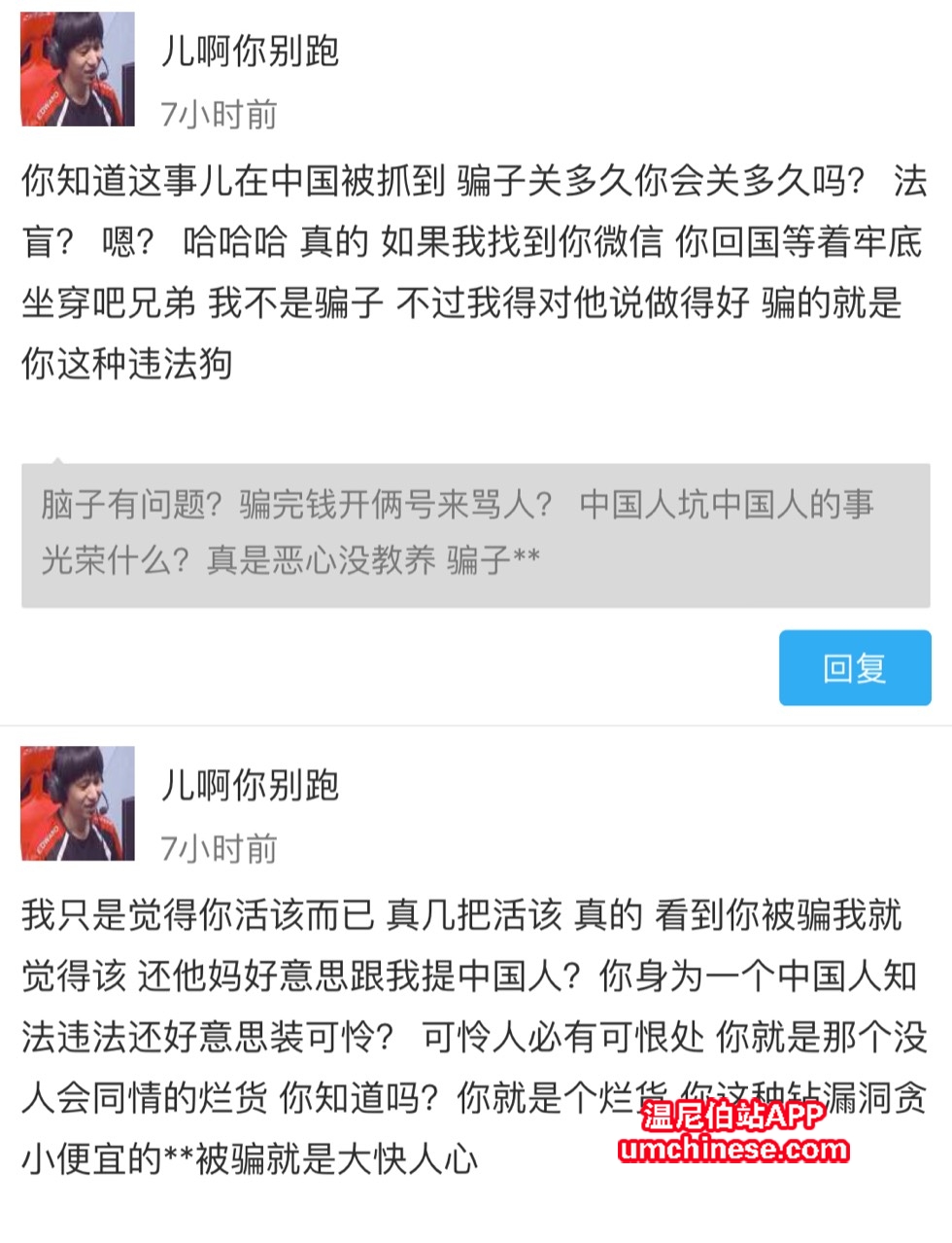 行啊 对自己说的话负责 我没问题? 走啊 报警去小老弟? 谁不负责谁是狗怎么样? 看看最后谁会待在局子里? 你挺牛逼啊 私信骂老子完了屏蔽 还说我莫名其妙骂你? 你丫等着吧 这事儿没完 |
