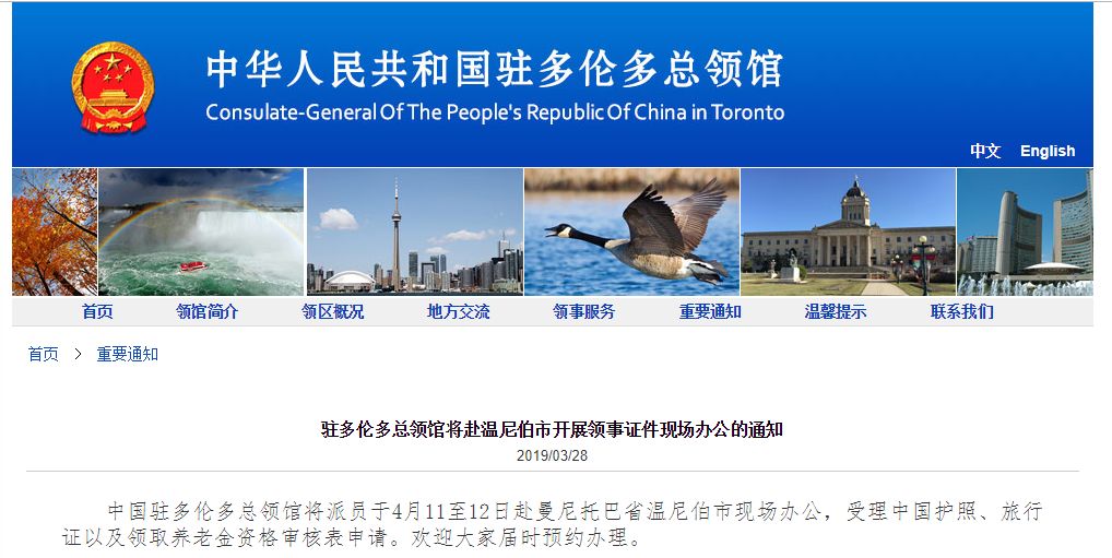 重大提醒 - 温尼伯华人注意啦!- 中国驻多伦多总领馆将派员于4月11至12日赴曼尼托巴省温尼伯市现场办公,受理中国护照、旅行证以及领取养老金资格审核表申请。欢迎大家届时预约办理。