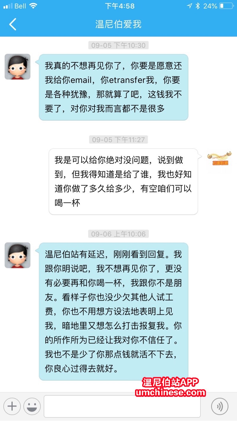 (拖欠工资与否不评论,只大致描述一下事态内容) 左小肥--左, 我爱winnipeg--骗子 骗子:左小肥还钱 左:(没理他,没回复) ---连续一年多,日日夜夜都在发左小肥还钱的内容--- 左:好吧,来我店里 ...