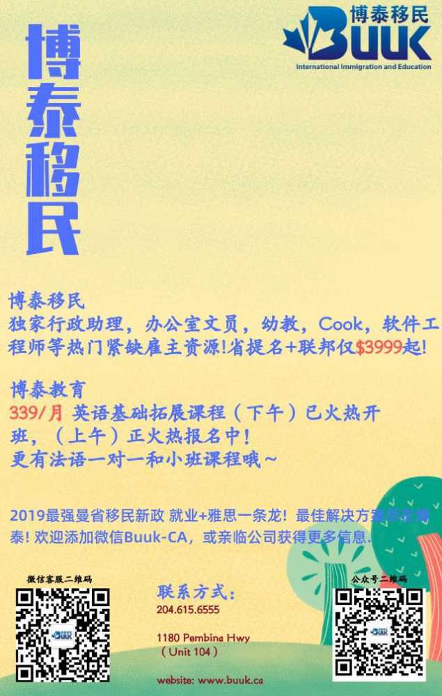 【博泰移民】 热门紧缺雇主资源! 独家行政助理,文员,幼教,Cook,软件工程师等资源 省提名+联邦仅$3999起! 【博泰教育】 $339/月英语法语基础➕拓展课程 火热开班并火热报名中 2019最强曼省移民新政 就 ...