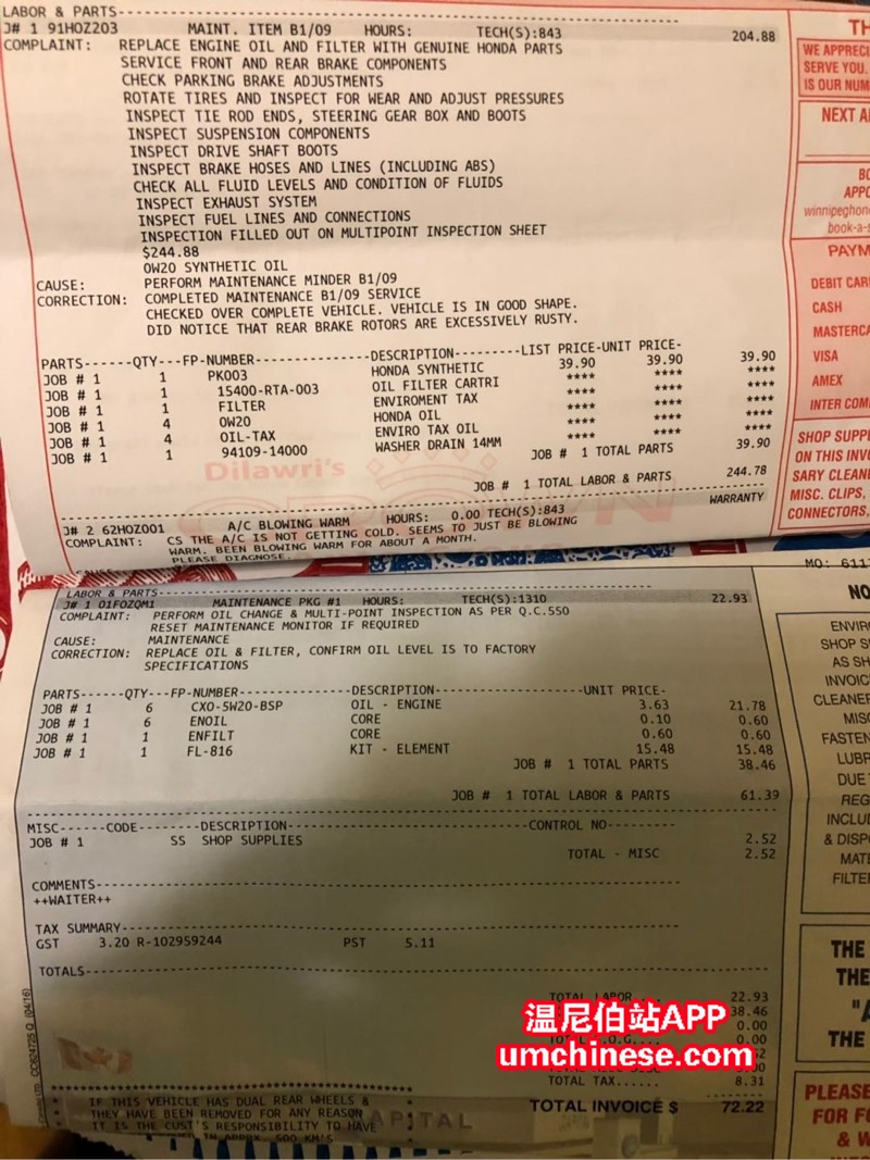 你这是service B啊 ,不止换机油了,这是刹车涵盖的。你没给他们车明白么 serviceA 含税70+ 不会加别的。他们肯定建议你serviceB 你没问价格吧。225加人工三百正常,别问我怎么知道因为我也在honda 保养过哈哈 |