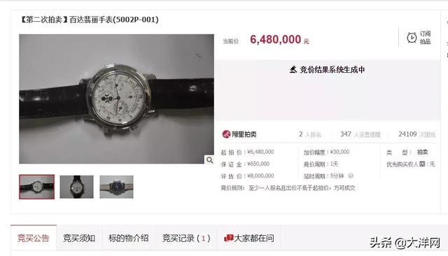 8月1日上午,安徽省司法厅原副厅长程瀚涉案物品进行二次拍卖,其中上次流拍的百达翡丽手表(5002P-001)起拍价从720万元降至648万元。有两人报名参加竞拍,一人出价648万元,2日上午9时以底价成交。 这块手表的背面 ...