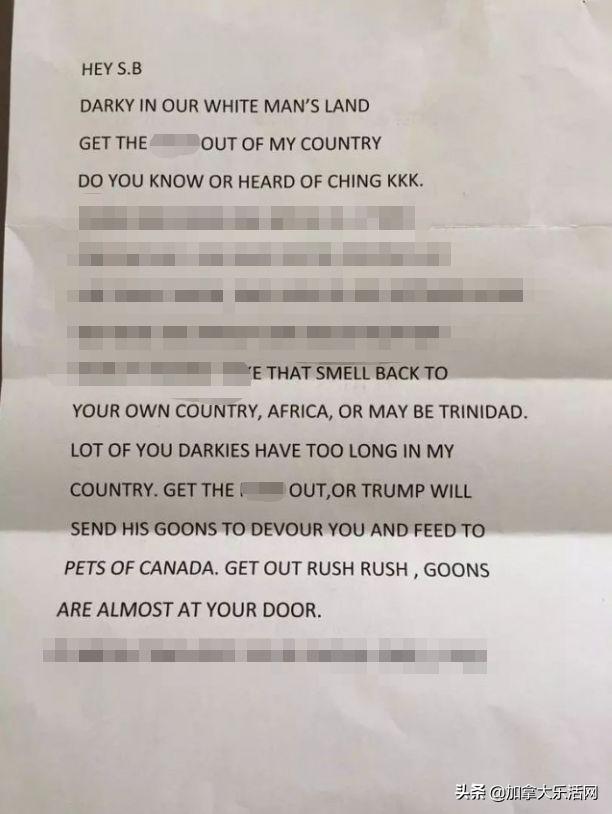 家住高贵林的S女士近日收到一封内容极其粗俗露骨的种族仇视恐吓信,信中用错漏百出的英文,大写加粗地表达对亚裔、非裔和拉美裔等种族的歧视和侮辱。以下是正文内容(部分内容过于露骨和低俗,已经被屏蔽掉): ...