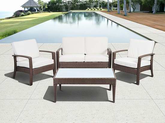 Amazon网店销售,原价:1184加元,现价:354.82加元包邮, 采用铝合金结构,仿柳条编织而成,坚固耐用,防霉菌、腐蚀和紫外线,共包含1茶几,1个双人沙发,2个单人椅,配备柔软坐垫和靠垫,送日常维护防腐剂。 链 ...