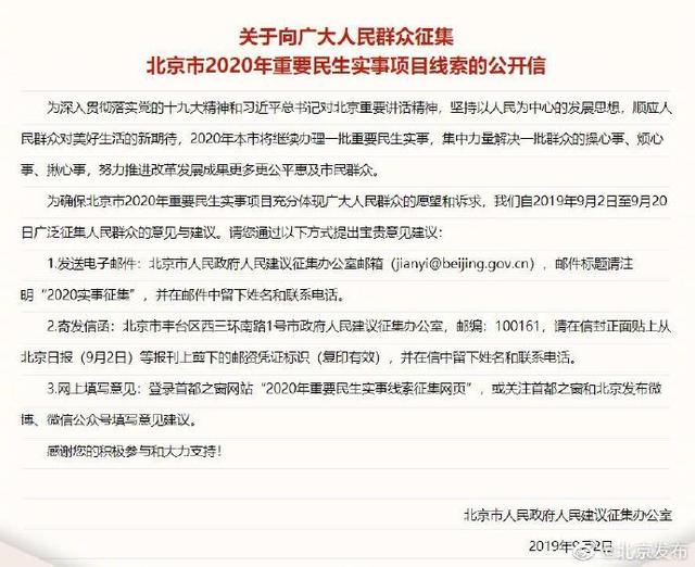 2020年您有什么期待?出行畅通、购物便捷、环境宜居……2020年重要民生实事项目征集线索开始啦~您的意见很重要!点击http://www.beijing.gov.cn/hudong/diaocha/wenjuan/mahlmrg913e.html 来提建议吧~ ????