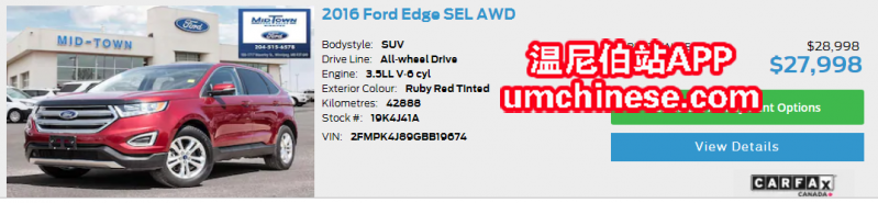 16年福特Edge SEL高配,43,000KM,配置齐全。 空间大,动力足。全景天窗,皮座椅,加热座椅,导航,Apple Play,倒车影像。。。 车子详情链接 https://www.mid-townford.com/used/Ford/2016-Ford-Edge-winnipeg-8 ...