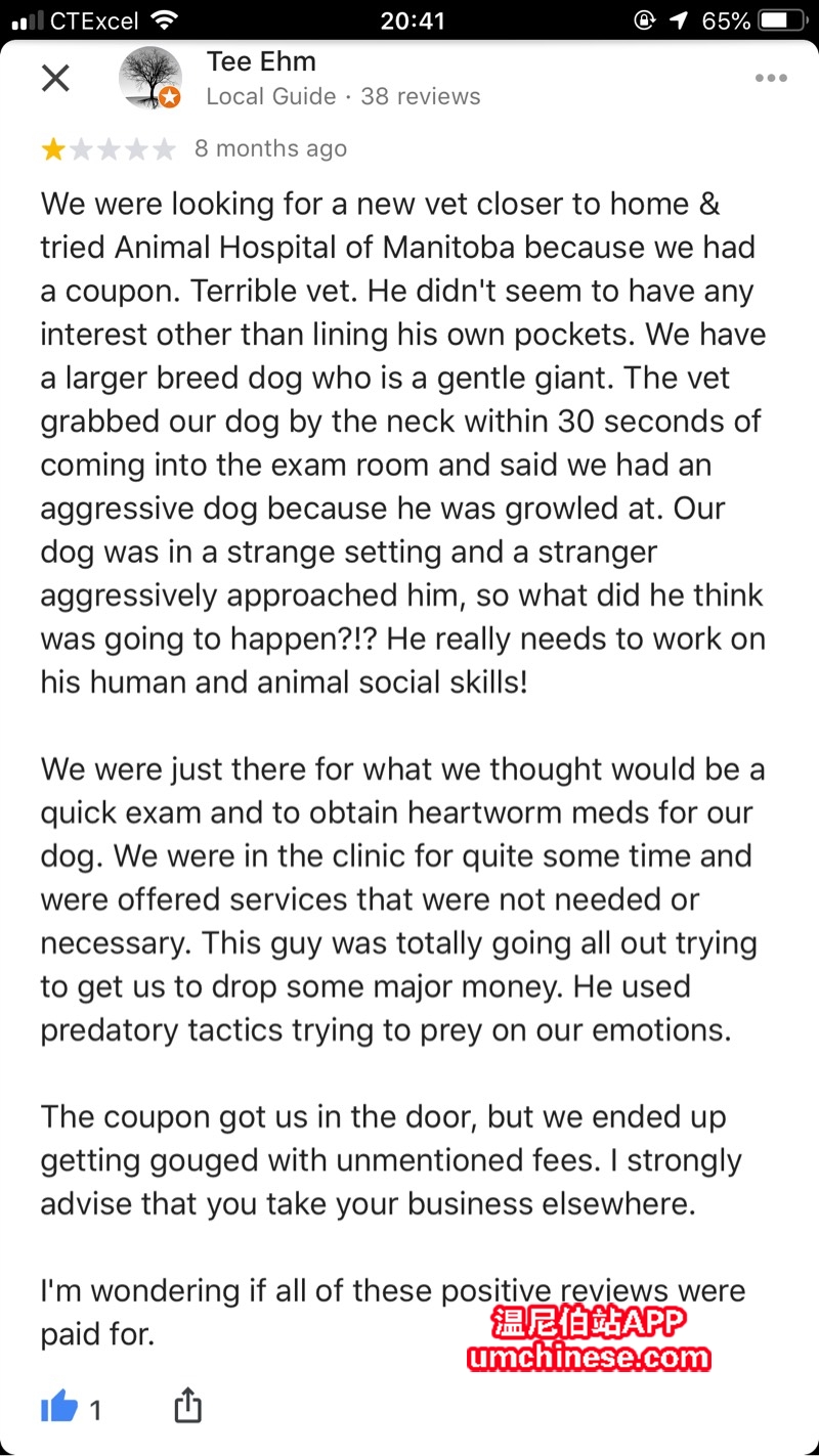 Transcona Veterinary Hospital 找Dr K 我每次都去这家医院 从来没有推销产品给我 而且便宜 就是有些远 从南区过去 但我也坚持去 Dr K 相当认真负责 |