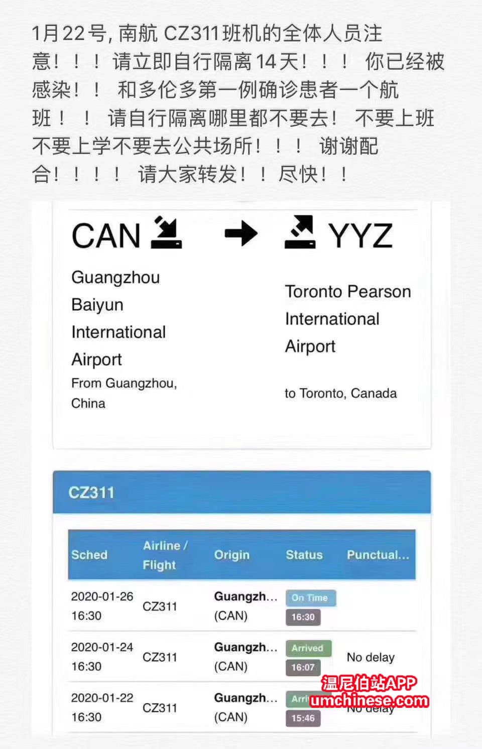 转发:求扩散!多伦多有1人确诊了!22号从广州飞回来的,同飞机的乘客赶紧联系医院! 南航CZ311的全体人员要注意!