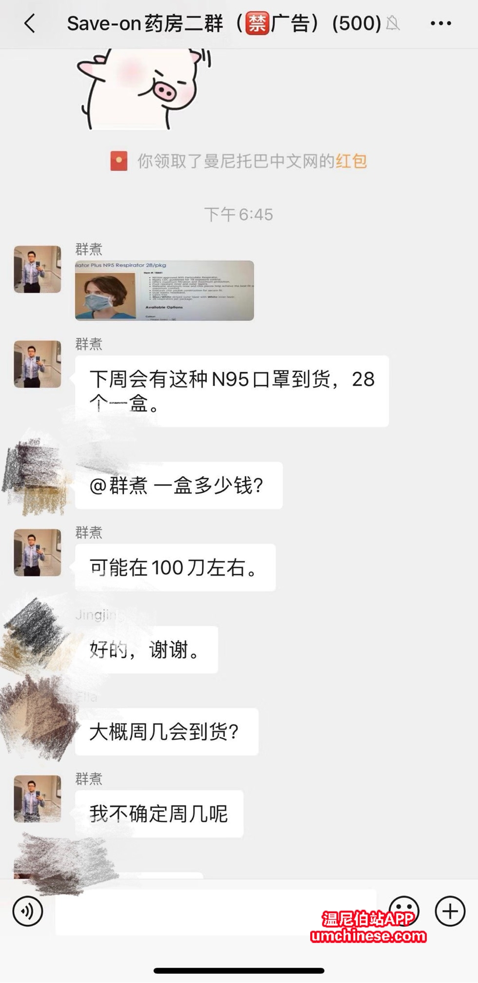 现在这个行情N95 100刀左右一盒不贵了,更何况是药房卖的,为截图里的群主点赞,口罩到货先想着通知咱们华人。 |