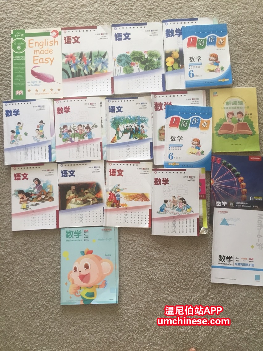 图中是孩子四五年级的,国内的沪版教材和练习册。是用过的。如有不嫌弃的,可以给孩子翻翻知识点。还有一些学而思的练习。电话:4319978891。 短信问询。