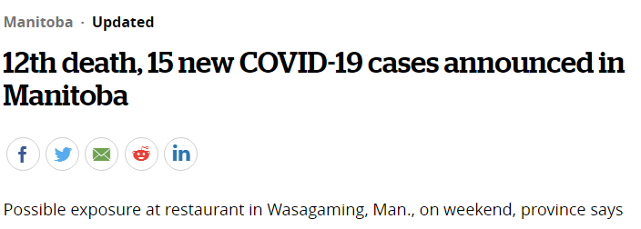 曼省疫情播报 省卫生官员说,又一名患有COVID-19的人在曼尼托巴省死亡,使该省与冠状病毒相关的死亡总数达到12人。今天还宣布了15例新的疾病病例,其中13例在草原山区卫生区。今天的更新使全省已确诊的病例总数达 ...