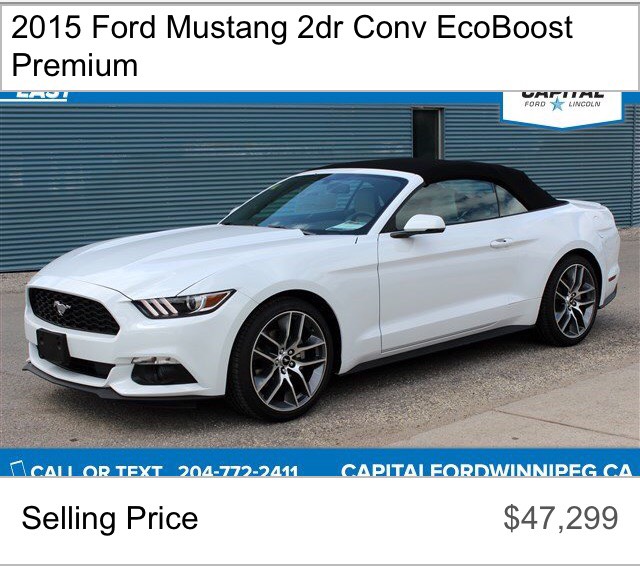 最后两台野马特价清货 白色为敞篷自动档、 蓝色为硬顶手动档 详细信息请来电垂询 电话:204-898-7766 微信:JackZhangCanada 地址:555 Empress Street (紧邻PoloPark东侧)