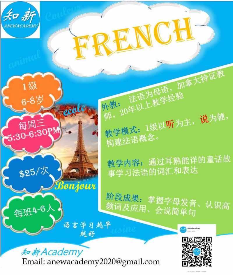 知新学院隆重推荐分别适合6-8岁和9-10岁孩子的法语课,由认真负责的母语为法语的老师任教,价格优惠,有兴趣请咨询!