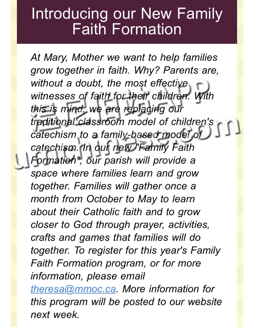 我们教堂将于10月份到来年5月份会有每个月一次的家长、孩子关于信仰方面的学习,有兴趣可以和我联系或者直接发图片上的邮件报名参加~