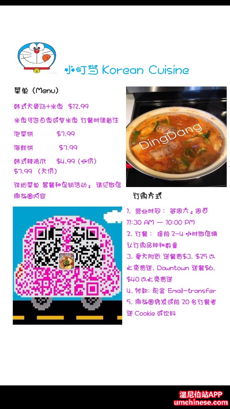 小叮当Korean Cuisine 本周六试营业 本店主营:韩式大骨汤 泡菜饼 海鲜饼 韩式辣鸡爪 注:试营业期间大骨汤只要10.99(还附带米饭一份噢) 喜欢吃韩餐的朋友 还在等什么 快点预定吧 联系方式加微信:DingDang_Y ...