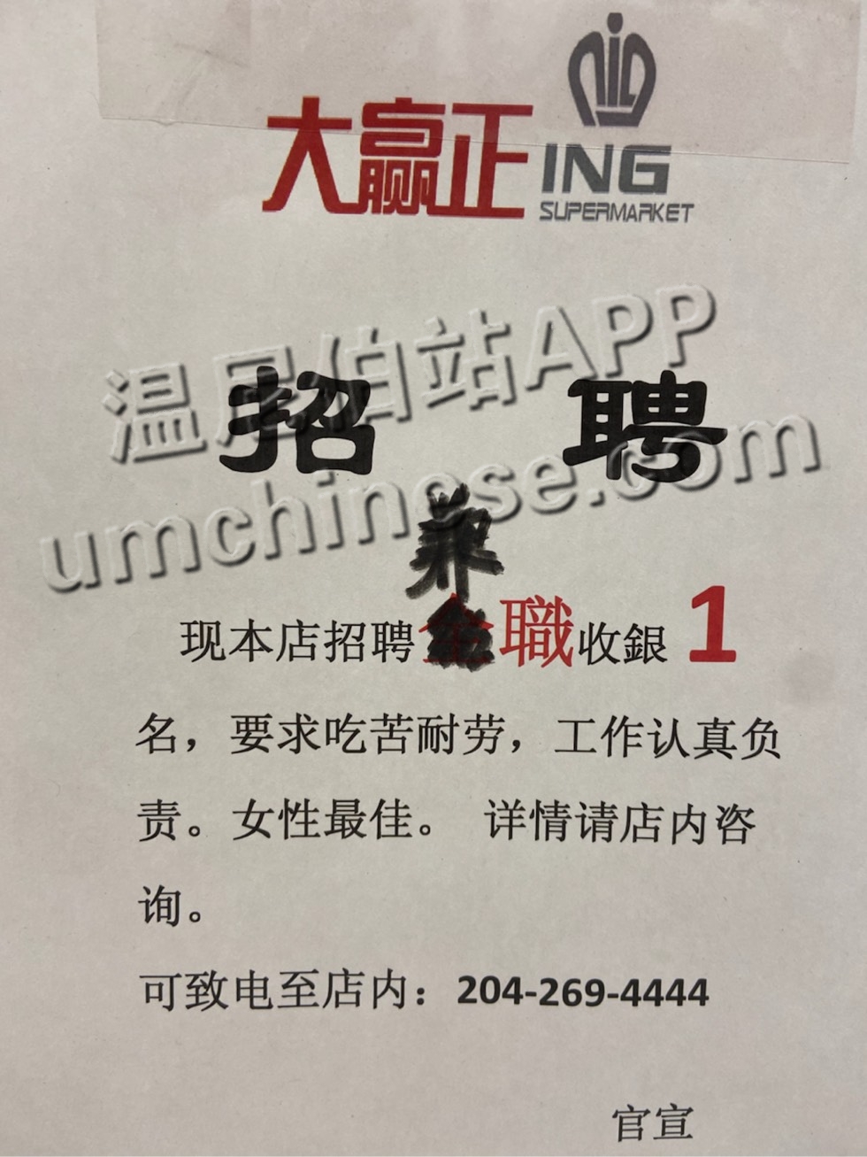 有意者店内询问或电话咨询: 204-269-4444