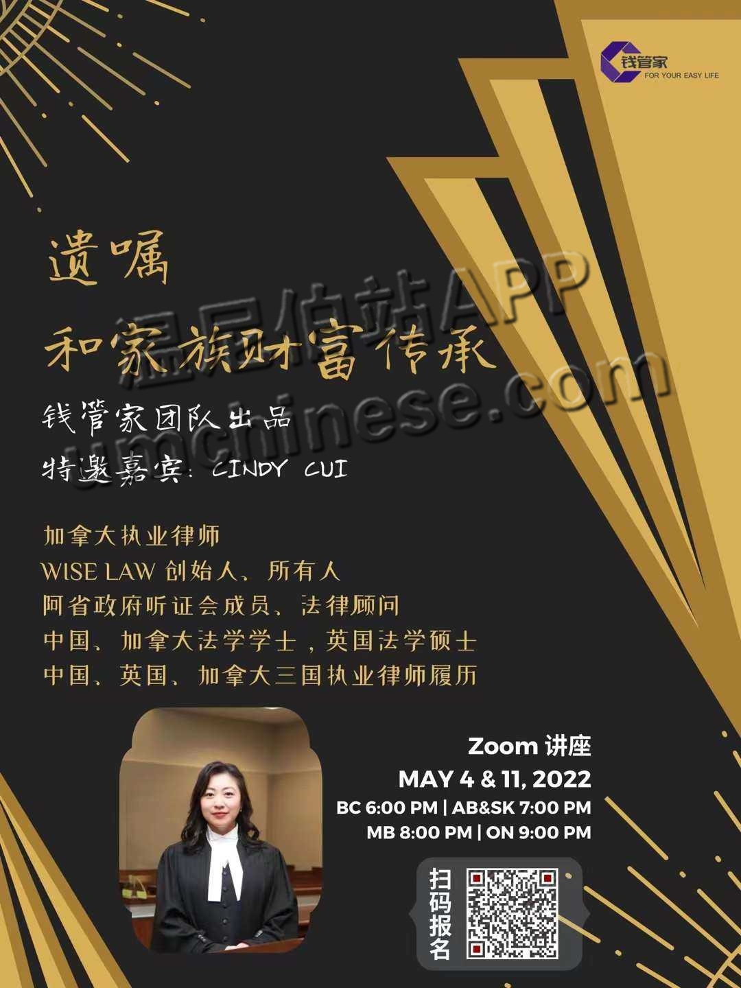 钱管家团队最近讲座通知: 5月4号主讲遗嘱和遗嘱认证, 5月11号主讲家族信托和资产传承。 加拿大诉讼律师Cindy Cui主讲 带你提前看到未来 如果您感兴趣,请扫二维码私信报名。