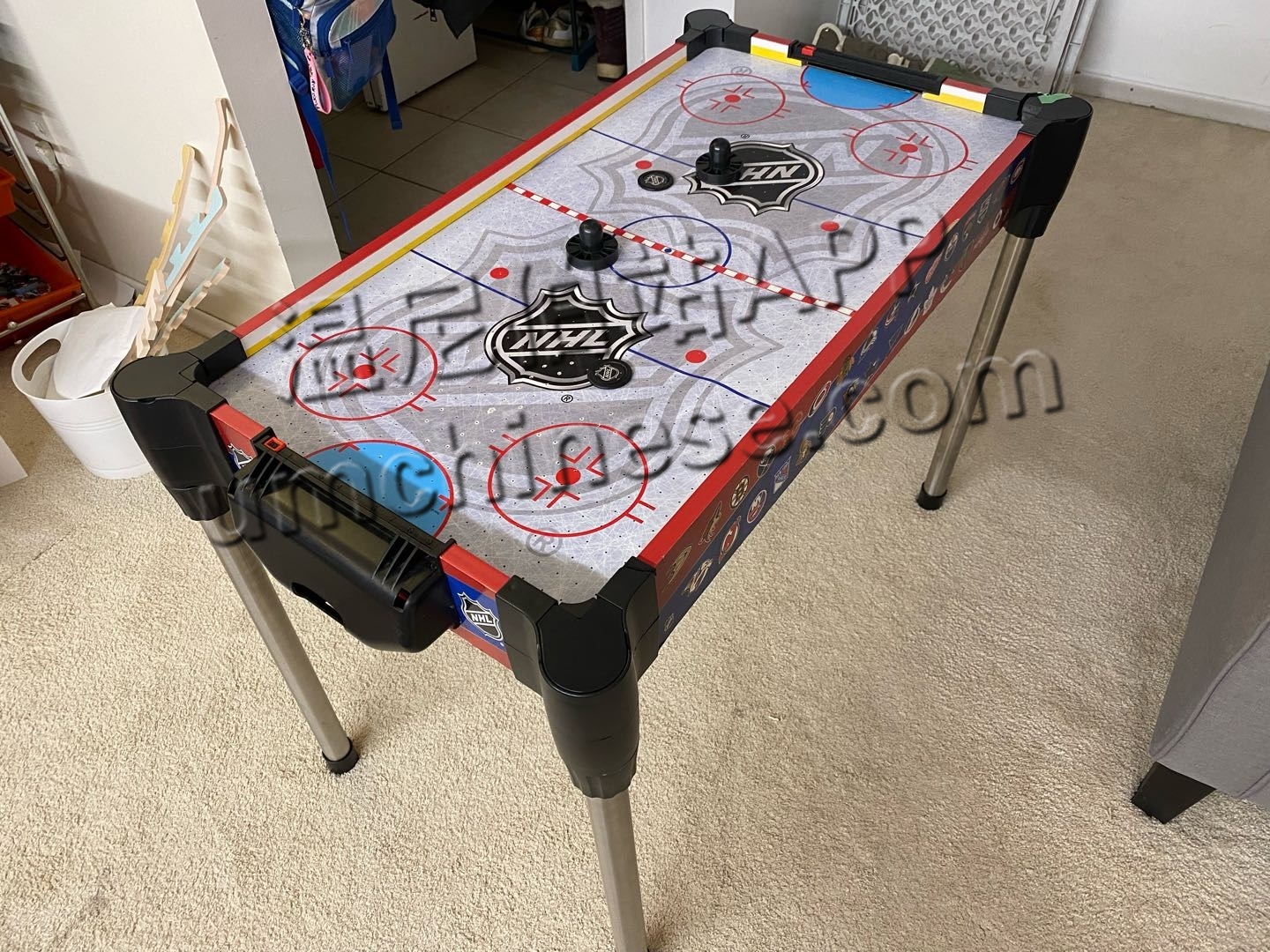 用8节5号电池产生气体玩冰球 桌面有小部份没粘平整 在意的勿扰 只需$30 短信431-3882105 任意小车都可装下 腿可拆卸