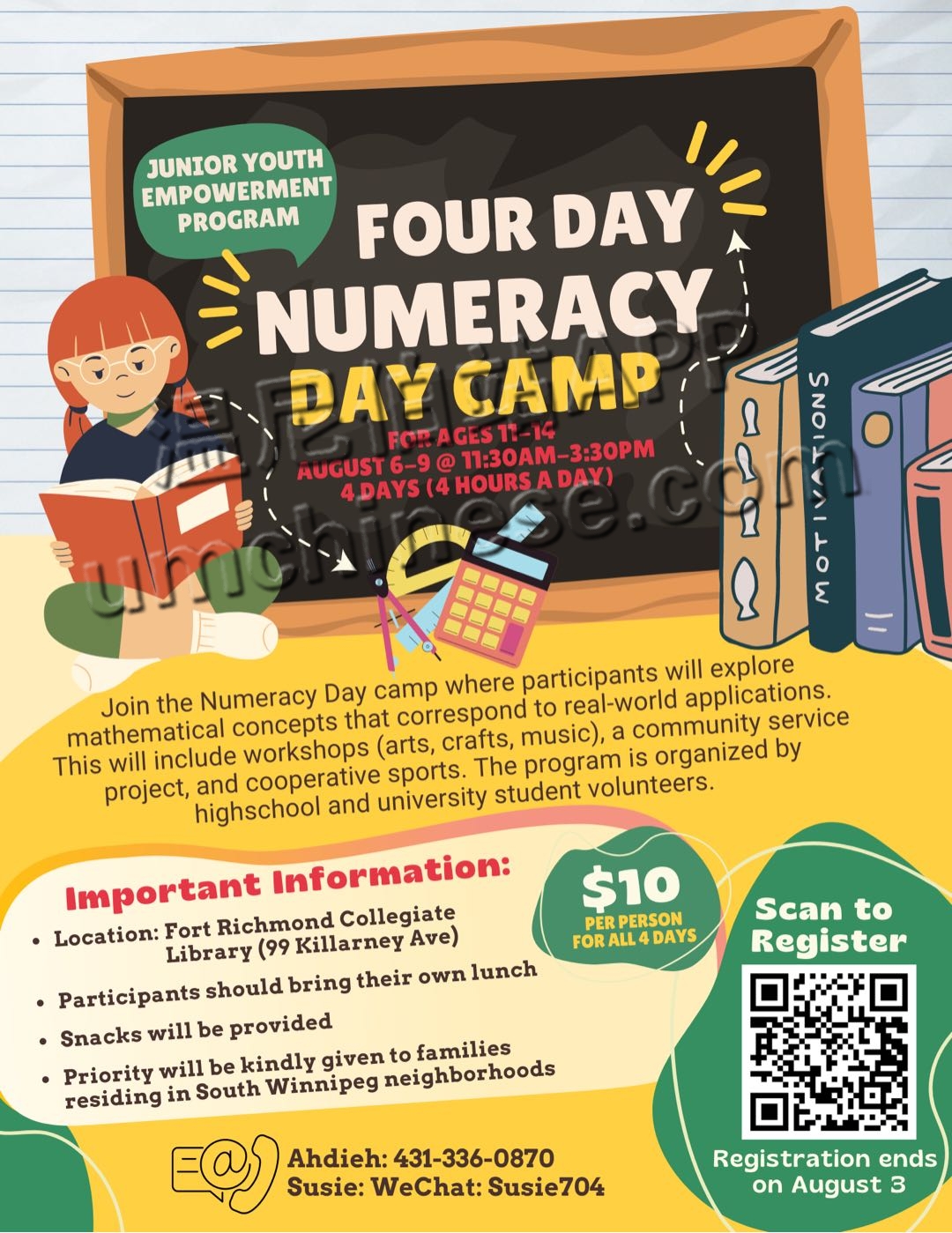 8月6日~9日有为期4天的青少年夏令营,在南区FRC 高中的图书馆,每天4小时,四天总共10刀,详情见海报