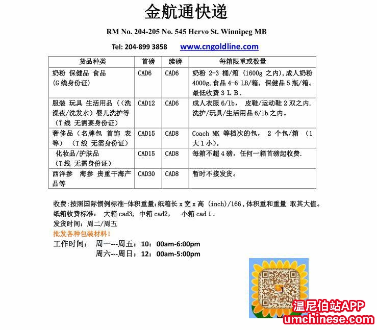 金航通快递是在温尼伯正规注册公司,与锦程快递合作,承揽快递业务。发往中国的奶粉、保健品和食品等快件,安全快捷,价格极具竞争力。同时生活用品、化妆品、包包等装箱数量大,不限箱数,通关快捷。同时也承接一线 ...