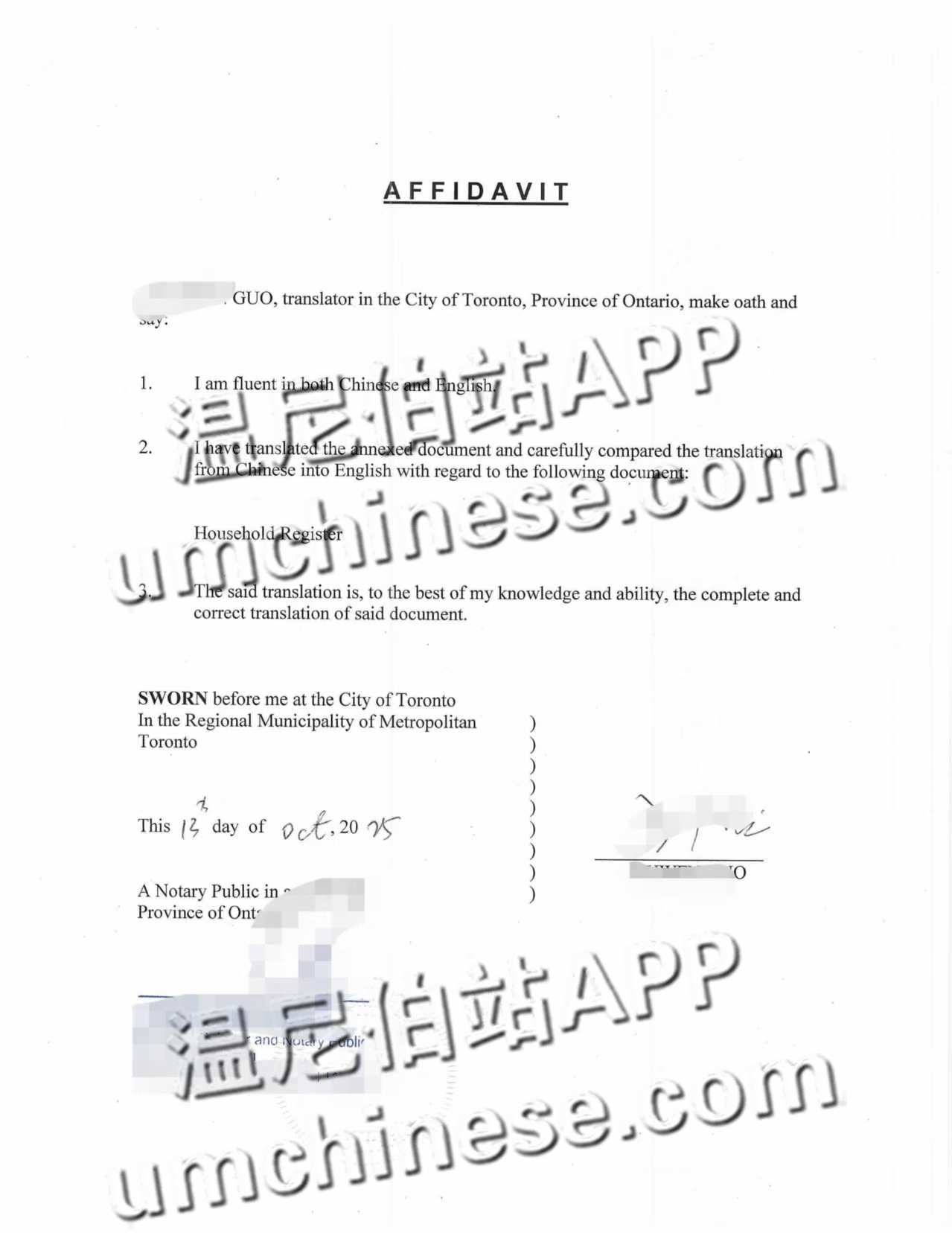 ——华译网华人公证处 1 天内完成,加拿大律师推荐客户案例 2025 年 10 月,加拿大华译网华人公证处刚刚完成一起中国户口簿文件翻译公证业务。客户居住在多伦多北约克,经当地一家家庭律师事务所(Family Law Offic ...